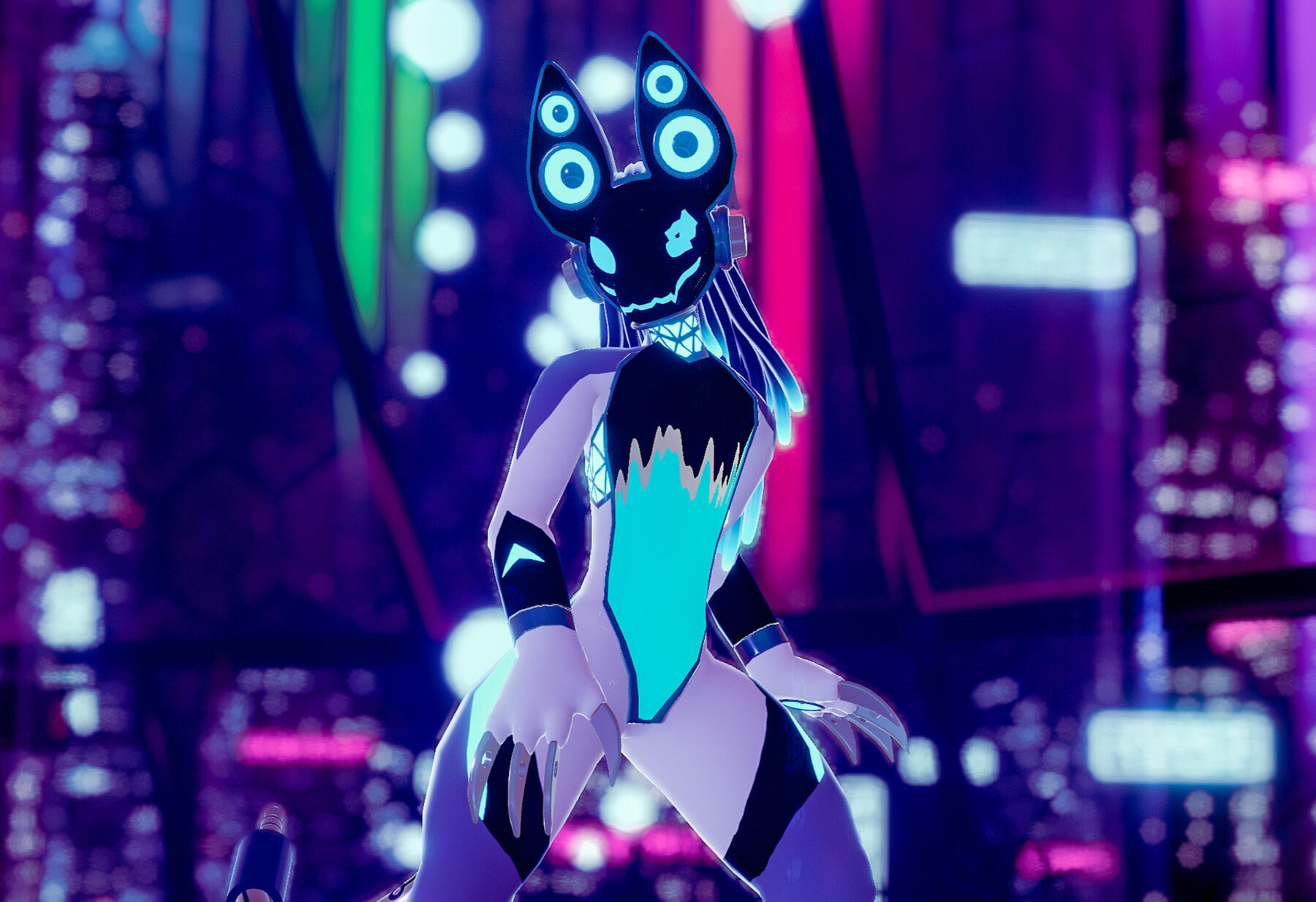 features: custom female blendshape (edited snout, cheeks, etc.), modified hair, added face tracking, custom Audiolink-enabled texture, fitted jacket